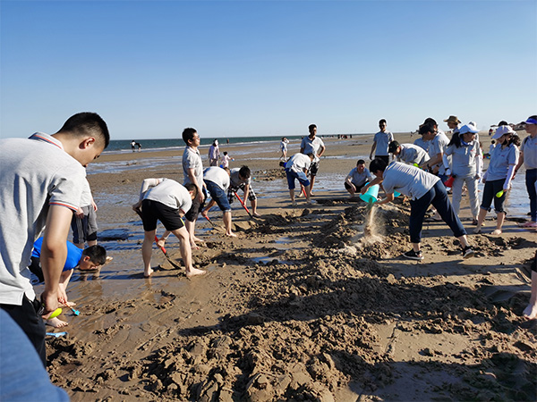 面朝大海,大家你一锹我一铲,齐心协力在沙滩上雕筑下“江南在线注册”的字样,许下共同的心声——每个人都是一粒沙,但只要勠力同心,便能聚沙成塔!