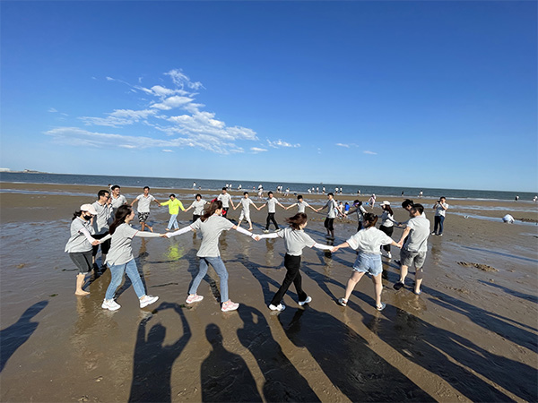 大家在沙滩上玩起了人体呼啦圈、沙滩螃蟹、拔河等娱乐活动,笑声、欢呼声、呐喊声此起彼伏,放松身心、贴近彼此。